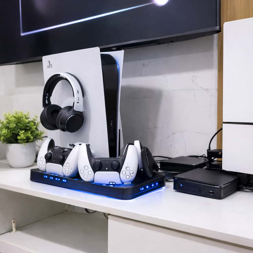 Gracias a su diseño todo en uno, podrás cargar tus mandos, colocar tus auriculares y mantener tu espacio de juego limpio y organizado en todo momento.